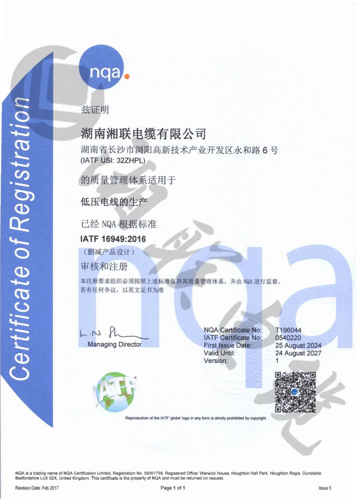 9月,湘聯電纜成功獲得了IATF16949:2016質量管理體系認證。IATF 16949:2016標準是專為汽車行業設計的質量管理體系標準,此項認證標志著湘聯電纜在質量管理體系、產品品質等方面均已滿足汽車行業的高質量管理標準。