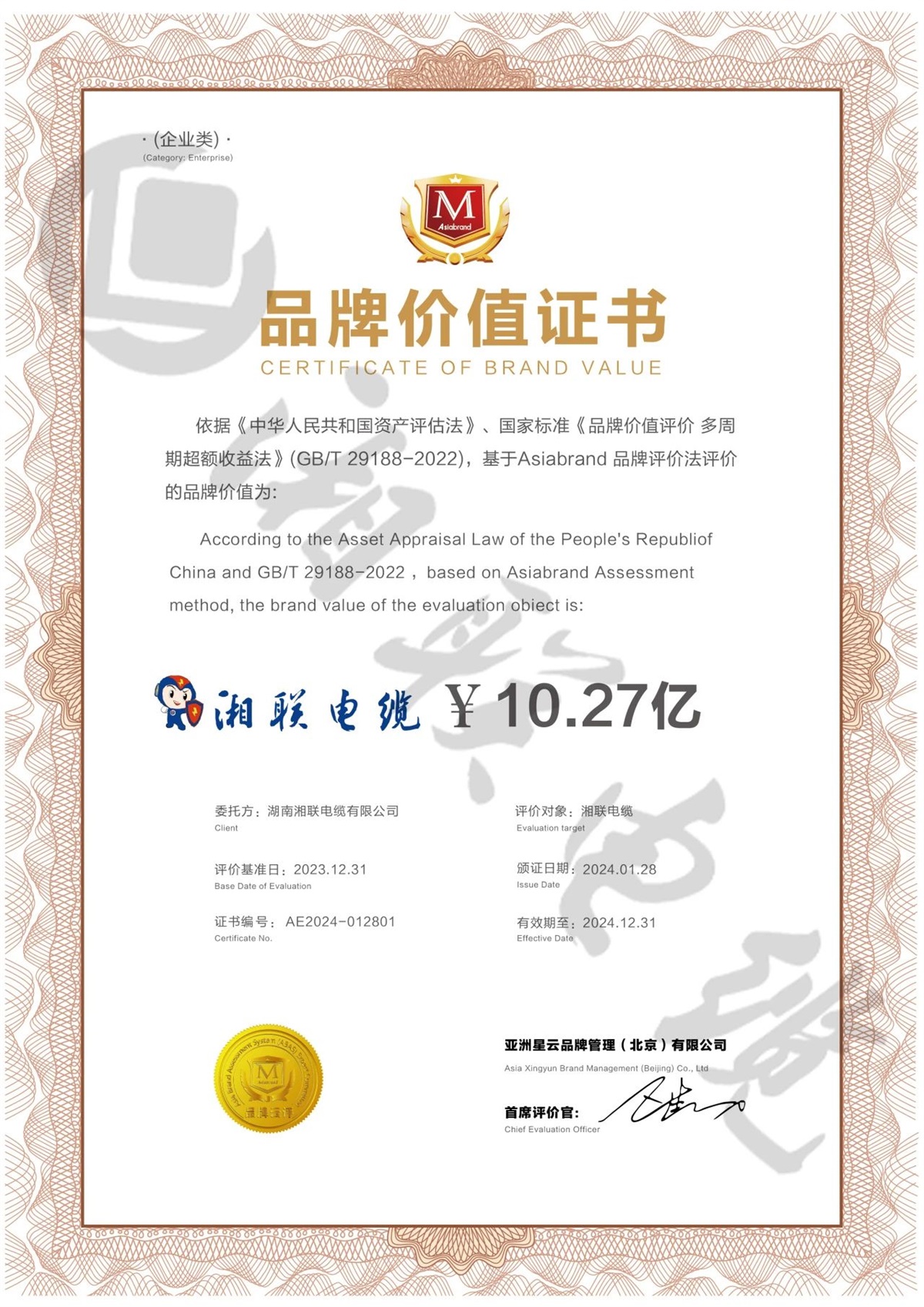 1月,經權威品牌評價機構 Asiabrand 依據《中華人民共和國資產評估法》、國家標準《品牌價值評價 多周期超額收益法》(GB/T29188-2022)對湘聯電纜進行全面評估,湘聯電纜品牌價值達10.27億。