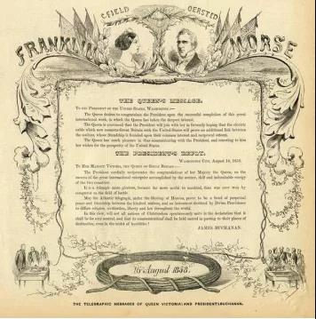 幾個(gè)小時(shí)后,世界一片歡騰,全世界的人們都在興奮的等待著這一刻。1858年8月16日,維多利亞女王發(fā)給美國(guó)總統(tǒng)布坎南的賀電通過(guò)海底電纜傳到北美,布坎南向英國(guó)女王回電,同時(shí),禮炮鳴放100響,慶祝人類這一偉大的歷史時(shí)刻。